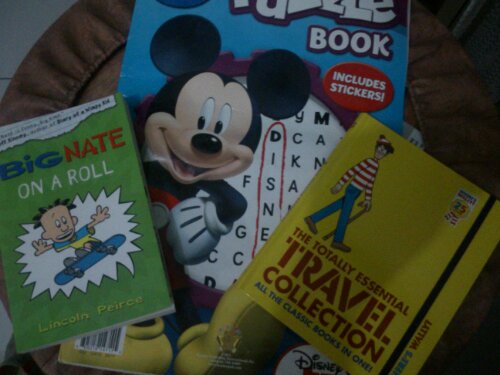 Untuk menemani perjalanan kali ini ada buku-buku yang cocok untuk anak-anak. Untuk kakak dia memilih Big Nate, sebuah novel grafis dengan tulisan besar-besar dan kisah yang lucu, khas anak SD.