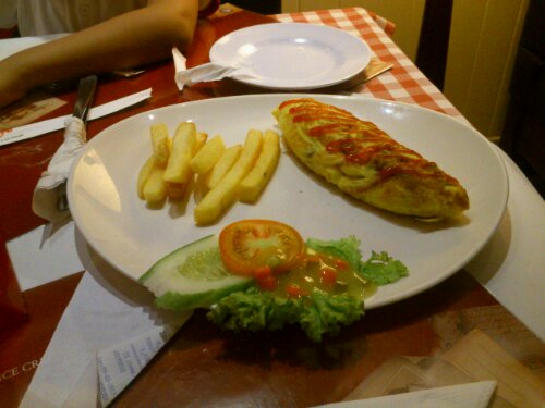 Omellete. Kayanya kita mesti niru mereka kalau dinner, makan jangan berat2. Itupun kentang yang ngabisin bapaknya. Telurnya enak, lebih enak dari kid’s mealnya BonAmi. Yah, secara harga beda yah..hehehe…