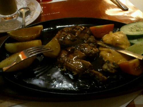 Fish steak, spicy barbeque. Dagingnya ikan tenggiri, pilihan lainnya digoreng tepung. Ikannya ngga terlalu gede *apa gw salah lihat yah di buku menu?* trus amisnya masih berasa dikit. Mungkin harusnya pakai jeruk nipis yang disediain di samping. Sausnya sama kaya sirloin, menurut gw kok pas2 aja yah.