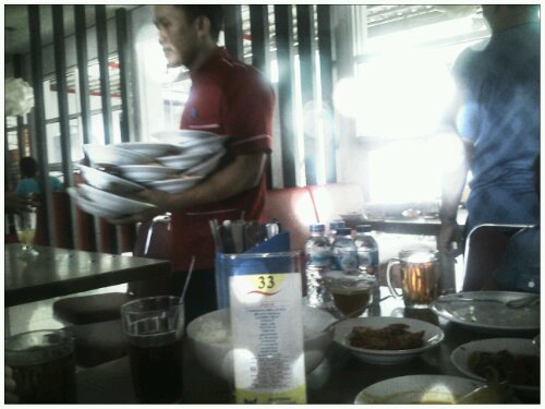 Begitu datang, langsung setumpuk makanan disajikan dengan rapi di meja. Selalu kagum dengan pelayan restoran Padang, aksi akrobatiknya bikin penasaran, gimana caranya bawa piring segitu banyak berbarengan. Meja kini tambah lengkap dengan nasi putih, dua gelas cocktail, tempat cuci tangan dan teh tawar hangat.