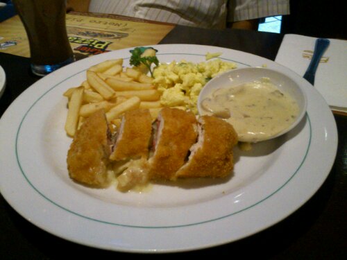 Kalau yang ini Chicken Cordon Bleu. Jamur, ham, ayam, dibungkus dan digoreng dengan tepung. Trus pelengkapnya scrambled egg sama french fries. Saus jamurnya enak.