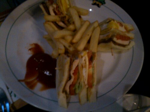 Club sandwich, makan 2 aja kayanya udah kenyang ya, padahal isi 4. Isinya yah lapis-lapis gitu deh. Tomat, selada, telur, ham, ayam..lengkaaap!