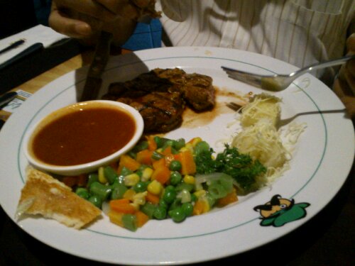 Yang ini Tenderloin Australia. Dimasak well done, kentangnya boleh milih mashed potato, atau french fries. Ok sih, sausnya lumayan. Tapi kok gw lebih suka kalau disajikan di atas hot plate atau hot stone yah…hehehe…sugesti doang.