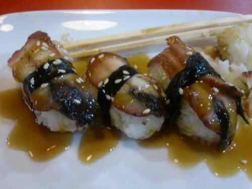 Ada lagi Nigiri dan Sashimi, terdiri dari 4 macam. Kita nyobain Unagi Nigiri dan Tamago Nigiri (telur). Euh karena ada sausnya, belutnya ngga kerasa. Tapi selamet buat si telur, biasanya tawar agak manis, sekarang jadi spicy karena ada sausnya.