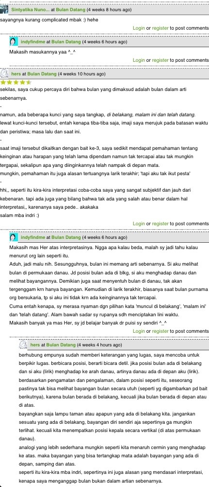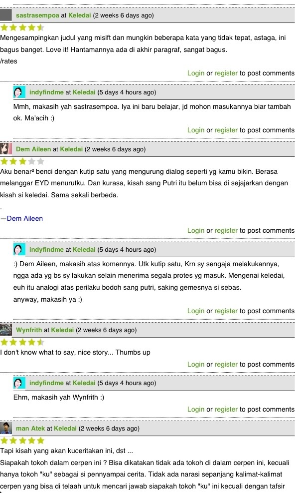 Kalau dikaitkan dengan mengharap puja puji, siapa yang ngga mau? Buat blog pribadi, dikunjungi aja udah senang. Tapi saya juga mengharapkan ada masukan mengenai karya. Itu sebabnya saya suka ngeteng (baca : menautkan link) di komunitas tempat para ahli berkumpul, atau lempar tulisan ke situs para penulis berkumpul. Tempat dimana saya belum dikenal, sehingga orang bisa lebih ngga sungkan melontarkan pendapatnya. Ini beberapa contohnya.