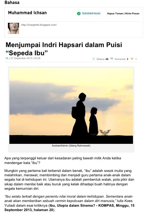 Lalu, tersanjung dong saya ketika Beliau berkenan ‘membongkar’ puisi saya berjudul ‘Sepeda Ibu’. Puisi sederhana yang saya tuliskan karena (selalu) trenyuh melihat seorang ibu yang membonceng anaknya menggunakan sepeda.