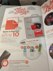 Bayangin aja, 6 jam nganggur, ngapain? Kalau penerbangan malam, ya tidur paling sip. Karena itu mereka menawarkan Premium Flatbed, alias bangkunya bisa ditidurin. Ngga termasuk makan, tapi dipinjemin selimut dan bantal. Meski ngga pakai fasilitas ini (karena mahal bo! Ke Cina bisa kena additional charge MYR 500, alias hampir 2 juta rupiah. Nah, kalau di kelas ngga premium, gimana? Bisa saja, ada persewaan selimut, kai ini harganya MYR 10. Dan ngga seperti di kereta api, dikumpulin sekitar 15 menit sebelum sampai tujuan, ini dikumpulinnya sejam sebelum landing (owh, inget masih kemulan di Turangga π ) Untuk perlengkapan tidur lainnya, ada bantal, douvet dan comfortable kit, semua bisa dibeli.