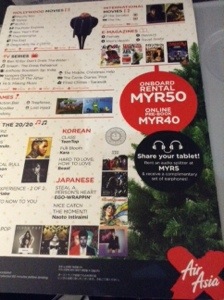 Mau main game dengan gadget bawaan, tapi baterai mau habis? AA X menawarkan powerbank untuk dipinjam. Mau nonton film? Alih-alih masang monitor di setiap belakang bangku seperti yang dilakukan penerbangan full cost itu, AA menggunakan tablet untuk memutarkan filmnya. Tablet yang bukan obat ini, akan menyajikan film, musik, atau game favorit Anda, selama perjalanan. Biayanya MYR 50 kalau pesan di pesawat. Eh, sebelah Anda pengen nonton juga? Tambah MYR 5 dan Anda bisa dapat tambahan earphone untuk nonton bareng.