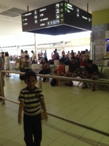Selesai, masuk lagi tahap berikutnya, karena kita bilang bawa drug tadi kayanya. Soalnya yang lain kok ngga. Disuruh berbaris, dan keluarlah…anjing. Anjingnya bukan yang K9 gitu dan galak, tapi tipe imut kepengen megang. Tugas dia mengendus-endus penumpang dan bawaannya, siapa tau bawa narkoba. Ada anak kecil di belakang kita nangis-nangis dideketin anjing.