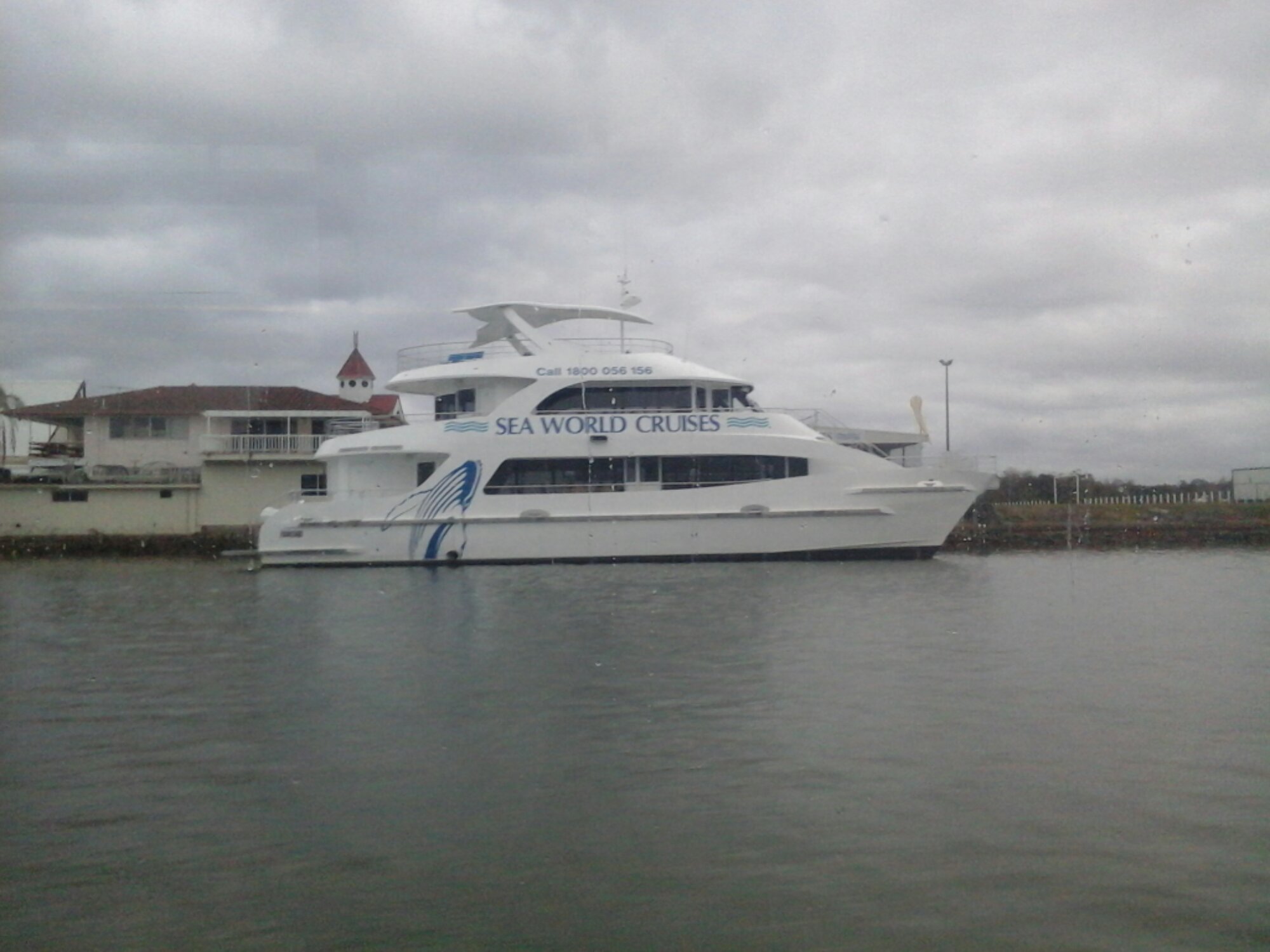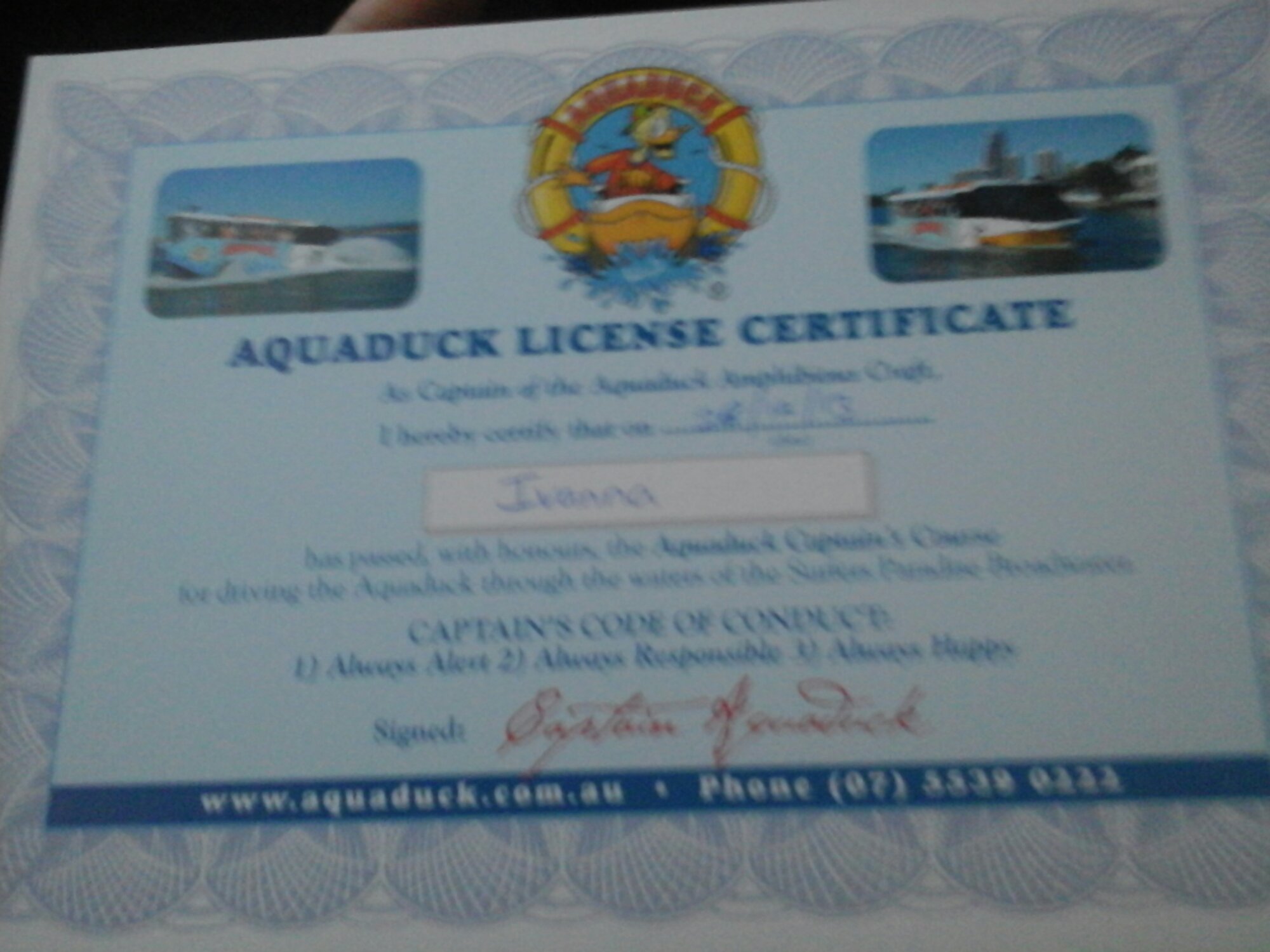 Akhirnya kita nyemplung ke Nerang River, cukup mulus pas masuknya. Trus setelah ngelewatin kumpulan kapal, masing-masing anak boleh duduk di kursi kapten sambil megang setir, trus kita foto deh. Trus selesainya dapet sertifikat. Di kapal juga dibagi souvenir kartupos dan bendera, dan…tentu aja dia jualan. Boneka bebek atau aquaduck, 10 aud. Sempritan bebek 5 aud.