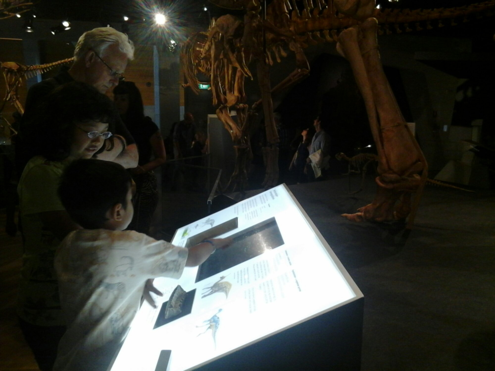 Museum ini gedeee banget. Terdiri dari banyak bagian, dan banyak lorong, jadi mesti inget-inget tadi sudah masuk yang mana. Ada dua lantai, lantai pertama isinya dinosaurus, children gallery atau tempat main anak, dan cerita tentang aborigin. Semua ditata rapi, menarik dna interaktif. Bukan cuma pajangan benda mati, tapi pengunjung diijinkan menyentuh, mendengar, dan menonton tayangan secara customized. Displaynyapun tidak hanya dipajang begitu saja, namun bisa dilihat dari bawah, dengan kaca pembesar, atau didengarkan suaranya.