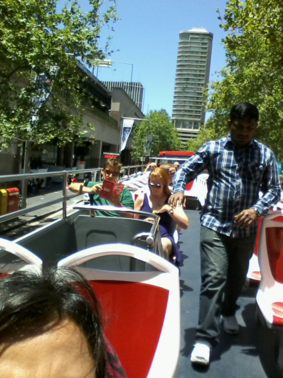 Saat di Melbourne, keberadaan bis ini juga gampang ditemui di Federation Square. Secara Melbourne kotanya ngga sepadat Sydney, lalu lintas juga ngga gitu padat. Heranlah kuta pas naik mau duduk di atas, ada tanda fasten your seat belt, lengkap sama seat belt di masing-masing bangku. Setengah ngga yakin kita pasang, dan…ternyata di bis ngebut sengebut-ngebutnya! Jadi rem mendadak wajib hukumnya, atau pas kita apes aja dapat sopir kaya gini. Mana Melbourne ini meski summer suhunya 18-24 derajat Celcius, lebih dingin dari ac di rumah 😛