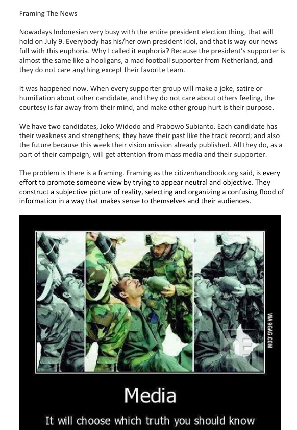 This is my second assignment for English Composition Class, on Coursera. It is about making a description of an image, and I tried to use the most trending topic in Indonesia, about President Election. But my topic is about framing the news, that is used both of the media and the candidate’s supporter.