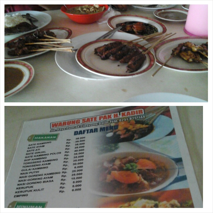 Di daerah Cisarua ada sate terkenal banget, namanya Sate Haji Kadir. Udah sampe jilid 6 lo! Maksudnya cabangnya sudah banyak. Ini sate Arab, jadi rasanya ya gitu deh. Dagingnya empuk termasuk atinya. Menjual sate kambing dan ayam, dengan kambingnya digantung di jendela.