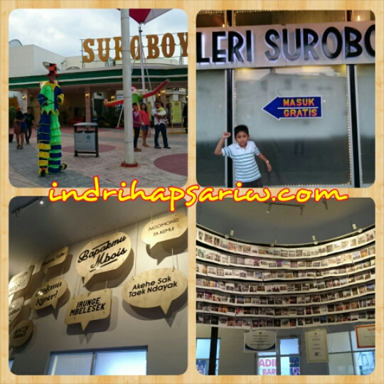 Dengan gelang tiket di tangan yang ada barcodenya, spot pertama adalah Galeri Suroboyo. Isinya sejarah dan hal-hal khas Suroboyo, termasuk kata – kata khas Cak Cuk Suroboyo. Banyak ruang kosong, informasi dan displaynya kurang variatif, tapi tetap asyik buat mereka yang hobi selfie.