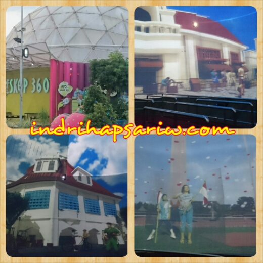 Beskop 360 kalau dari namanya sih bioskop yang bisa dilihat dari segala arah. Namun ternyata lebih dari itu. Awalnya kita disyuting dulu, disuruh ngacungkan bendera sama bikin poae hormat bendera. Trus disuruh masuk ke ruangan berbentuk kubah, dan ada besi-besi untuk memisahkan penonton. Karena penontonnya cuma kita, ya sudah kaya bioskop pribadi. Jadi ceritanya pertempuran Surabaya ini dibikin animasi, yang bisa dilihat dari segala penjuru. Kita seolah-olah ada di tengah pertempuran. Ceritanya seperti Battle of Surabaya. Saat ada tank datang, lantai tempat kami menonton jadi bergoyang. Lalu di ujung cerita, eh munculah kita berdua di layar, lagi mengacung-acungkan bendera. Horeee…masuk tipi eh bioskop! 🙂