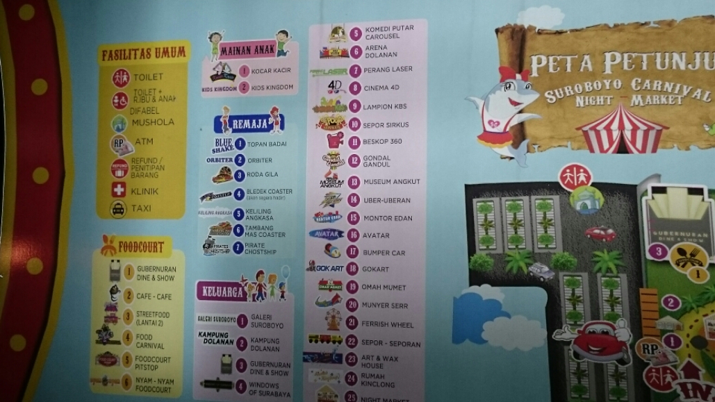 Nampaknya Suroboyo Carnival (SC)  memang dirancang agar khas Surabaya, bukan internasional. Bukan karena icon Suro dan Boyo yang nongkrong di depan pintu masuk, tapi spot kunjungan dan nama wahana juga mencerminkan hal yang sama.