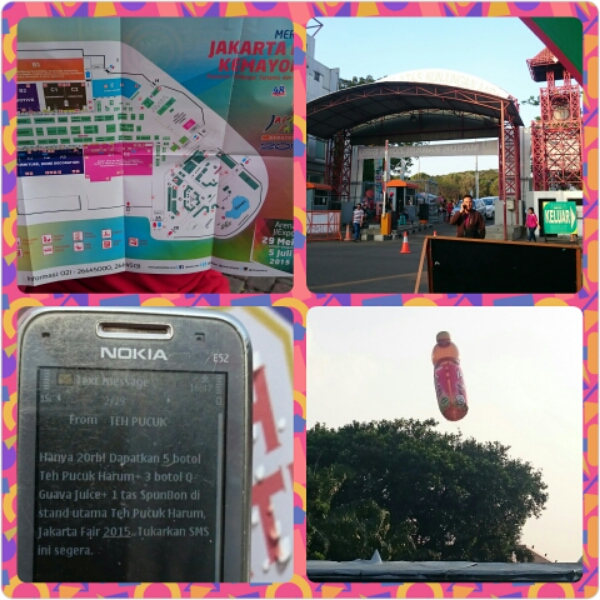 Harga tiket masuk 30 ribu per orang, termasuk anak-anak dengan tinggi di atas 1 meter. Tiketnya ini berupa brosur dengan berbagai penawaran di dalamnya, syaratnya harus beli. Ingat-ingat masuk dari pintu mana, biar ngga bingung pulangnya. Begitu masuk langsung disambut promo Teh Pucuk Harum. Oya serem ya teknologi jaman sekarang. Belum lagi masuk ke area parkir PRJ, saya sudah diSMS untuk mampir ke stand Pucuk Harum dan dapatkan promonya. So scarry..kok tau sih no Surabaya saya lagi jalan-jalan ke PRJ?Β π Promonya menarik, 20 ribu dapat 8 botol teh itu. Salahnyaaa… harusnya belinya tuh pas pulangnya, ini jadi nenteng 8 botol kemana-mana (penyesalan).