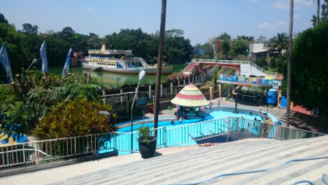 Tiket masuknya juga sama, 25 ribu rupiah per orang, ada tiket terusan 45 ribu rupiah. Pertama masuk kami disambut dengan… sekelompok tukang yang sedang melintas. Entah, sampai akhir kunjungan, banyak juga tukang yang sedang bekerja. Karena sudah berenang, saya cuma memotret dari atas kolam renang yang jadi kecil kalau dibandingkan dengan Selecta. Kapal raksasa tempat makan dulu kini menjadi kapal misteri.