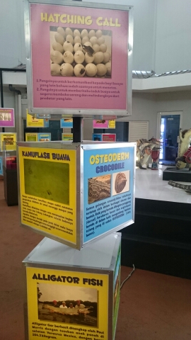 Masuk pertama kali, adalah media display semua tentang buaya. Visualisasinya bagus banget, ada yang 3D, ada sekedar poster yang menarik. Walah baru tahu Joko Tingkir itu bisa mengalahkan 40 buaya dan mereka malah nurut waktu disuruh mendorong perahunya. Atau ada Dewa Sobek, itu dewa buaya orang Mesir. Atau buaya yang sekali bertelur bisa 35-50 telur, buset dah, pantas kalau di penangkaran bisa berjejalan gitu.