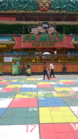 Turun dari kereta kami lanjutkan lagi melihat arena bermain yang ngga bertema buaya lagi. Ada arena playground yang statis, ada yang dinamis dengan mesin yang sibuk bergerak. Lalu ada taman tersesat, rumah trampolin dan outbond untuk anak-anak. Mungkin yang agak buaya adalah ular tangga raksasa yang ada di depan foodcourt ini. Oya untuk foodcourt konon menjual kuliner ekstrim, daging dan telur buaya. Tapi kemarin yang terlihat sih nasi goreng kambing.