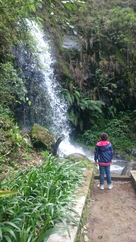 Ternyata obyeknya ngga cuma cafe, tapi ada dua air terjun. Mobilnya mesti naik turun jalan tanah lagi, lebih curam dan lebih sempit, demi menuju areal parkir air terjun. Air terjun pertama cukup kecil, tapi jalan turunnya aduhai dah. Sudah enak kok, pakai tangga jadi ngga khawatir terpleset. Cuma ya itu, naiknya saja bikin saya deg-degan 😀 Beberapa kali istirahat untuk ngatur napas 🙂 (jadi termotivasi untuk jalan-jalan selagi sehat :D)