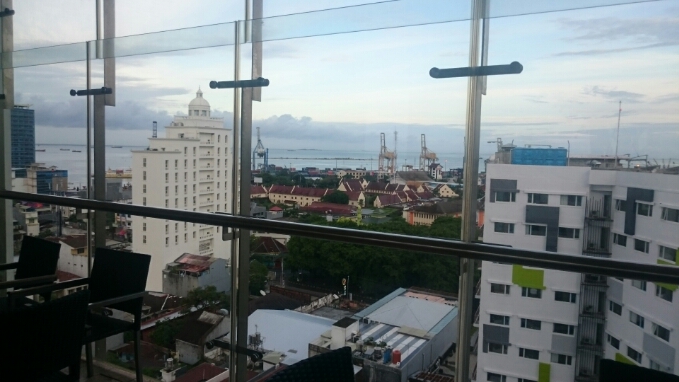 Lokasinya juga enak, dekat mana-mana. Pagi jalan kaki gitu (jam 7 wita karena terangnya baru jam segini, ya kaya jam 6 wib gitu) tau-tau nembus Losari. Sekeliling banyak restoran dan convenience store. Ada juga taman posisi di antara pertigaan yang bisa dibuat olahraga atau sekadar jalan-jalan. Makanan juga lengkap dan enak, dengan ruang makan yang selalu penuh. Ada sudut omellete, roti dan kue serta salad, serta pojok minuman. Jusnya aja ada tiga macam. Trus sudut sereal dan kudapan lainnya (pernah siomay, pernah mendon). Satu sisi masakan khas barat (baked bean, sosis, kentang, pasta) dengan bubur ayam. Sisi lain ada masakan khas Indonesia dengan pilihan nasi putih atau nasi goreng. Lalu sisi lain masakan khas daerah misal nasi kuning Makassar, nasi uduk Jakarta dan mie yamin. Di meja sudah siap aneka selai, pegawainyapun sigap menanyakan mau teh atau kopi. Roti dipanggang sendiri, lalu bisa milih tuh mau butter, keju, atau potongan daging (beef or chicken). Room servicenya juga OK, kita pesan Australian Lamb Chop serius kok bikinnya 🙂