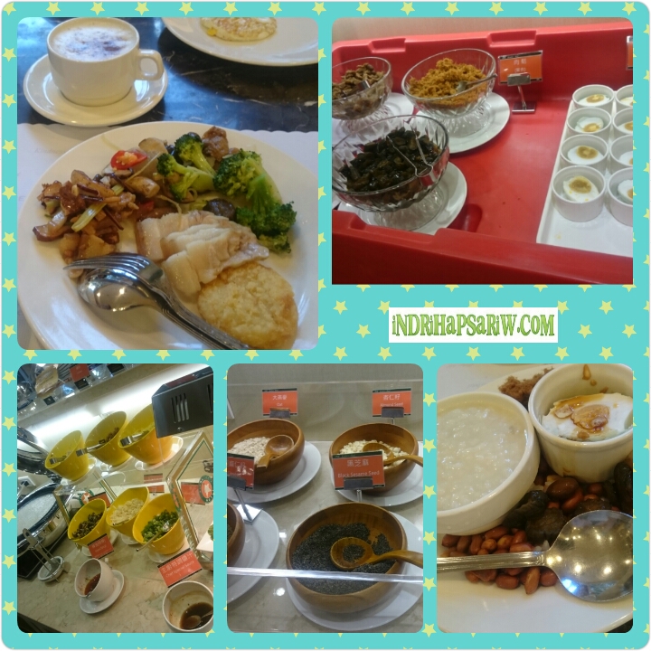 Di sisi lain ada roti dengan toaster dan berbagai isiannya, salad, bakpao dengan berbagai isian. Minumannya juga lengkap dan self service. Teh saja ada 6 macam, ada mesin kopi yang siap mengeluarkan espresso, americano, caffe latte, cappucino, hot milk atau hot chocolate. Ada juga susu kedelai putih dan coklat, teh labu dan orange juice. Di sudut ada omelette corner dan itu tadi, pojok ketan. Kalau malam pojok ini berubah menjadi tempat meramu minuman panas. Kalau di Surabaya kaya tahu takwa gitu, tapi ini pakai kacang merah. Display bakpao itu tetap.ada, isinya babi cincang dan telur asin. Lalu ada lotus rice dan telur direndam teh. Snack malamnya mengenyangkan dan rasanya enak, bukan yang disediakan pokoknya ada. Pas kita mau berangkat pagi-pagi ke Taipei, kita bilang bisa ngga minta take away breakfast. Ih sama dia dibawain sandwich, salad, dan kotakan caffe latte #terharu.