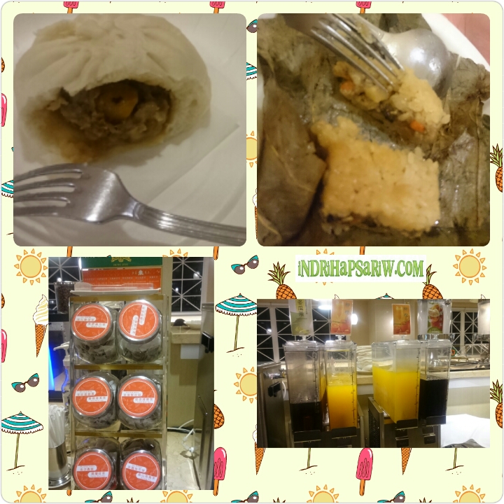 Di sisi lain ada roti dengan toaster dan berbagai isiannya, salad, bakpao dengan berbagai isian. Minumannya juga lengkap dan self service. Teh saja ada 6 macam, ada mesin kopi yang siap mengeluarkan espresso, americano, caffe latte, cappucino, hot milk atau hot chocolate. Ada juga susu kedelai putih dan coklat, teh labu dan orange juice. Di sudut ada omelette corner dan itu tadi, pojok ketan. Kalau malam pojok ini berubah menjadi tempat meramu minuman panas. Kalau di Surabaya kaya tahu takwa gitu, tapi ini pakai kacang merah. Display bakpao itu tetap.ada, isinya babi cincang dan telur asin. Lalu ada lotus rice dan telur direndam teh. Snack malamnya mengenyangkan dan rasanya enak, bukan yang disediakan pokoknya ada. Pas kita mau berangkat pagi-pagi ke Taipei, kita bilang bisa ngga minta take away breakfast. Ih sama dia dibawain sandwich, salad, dan kotakan caffe latte #terharu.