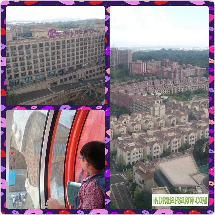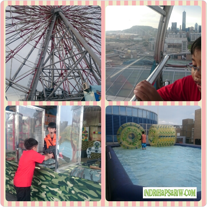 Dan yang seneng yang paling kecil, mainan kayanya buat anak kecil semua. Sesekali kami temani, tapi emang 4 lantai ini paduan mainan anak-anak dan cafe atau resto. Kalau yang gede-gede kayanya main di luar. Selain permainan biasa yang ada di theme park, ada gokart dan ferrish wheel lagi. Tapi tempatnya dong, di ujung yang berbeda 😀 Jadilah kami jalan lagi mendekati pintu masuk. Ferrish wheel disini sama konsepnya dengan Dream Mall, nemplok di atap gedung. Sepi cuma ada bianglala, tentu dengan sukses kami dapat kabin sendiri. Yang dilihat pemandangan Kaohsiung mau ke luar kota. Terutama komplek E-DA yang gedeee banget, mewah, tapi terkesan ngga berpenghuni.
