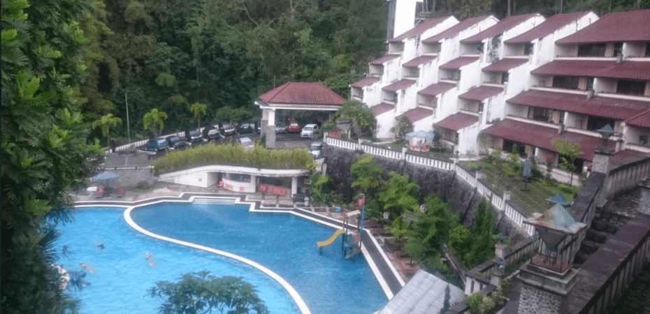Kamarnya luas, padahal saya pesan yang paling murah. Ditambah dua extra bed mestinya masih bisa, tigapun tamu masih bisa melaluinya. Cuma kalau sudah tiga ya mending buka kamar baru ya 😀 Kamar mandi luas juga, dengan air panas yang sangat bisa diandalkan kalau udaranya sejuk begini. Kamarnya sendiri ngga pakai AC, ngga perlu juga sih. Agak sumpek buka aja pintu geser yang menghubungkan balkon. Duduk-duduk cantik sambil lihat view yang outstanding: kolam renang yang bentuknya kaya yin dan yang, pepohonan cemara dan pemandangan kota entah Tretes atau Pandaan. Kongkow di balkon siang atau malam sama aja outstandingnya, karena kalau malam kolam diterangi lampu yang temaram, sementara dari kejauhan lampu kota mulai berkelipan. Kalau sudah begini males aja nyalain TV kabel atau berlama-lama menggunakan free wifi. Tapi ngga tau ya kalau kesana niatnya untuk kerja (gubrak deh :P).