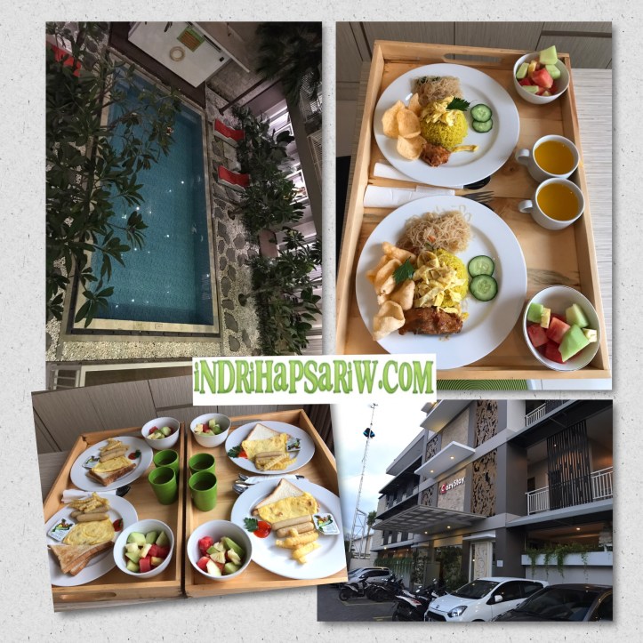 Kolam renangnya cukupan lah buat berenang anak-anak dan orang dewasa, bersih pul dengan kursi-kursi panjang yang nyaman diduduki. Sarapannya diantar ke kamar daaaan dengan harga segitu, dapat american breakfast atau indonesian breakfast lengkap begini ya sesuatu banget yaaa 🙂 Kalau ngga mau sarapan ini, jalan bentar udah nyampe ke Babi Guling Chandra yang sudah buka sejak jam 5 pagi.