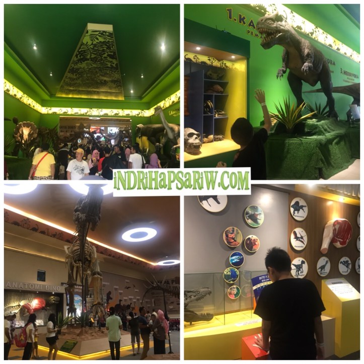 Dino Park sesuai namanya adalah taman dinosaurus dengan berbagai tulang, bentuk dan peragaan soal dinosaurus. Yang antri panjang kereta dinosaurus, kaya roller coaster pake basah-basahan gitu tapi yang versi ala-ala. Peragaannya bagus loh interaktif dan keliatan niat. Trus ada petugasnya juga kalau kepo pingin tahu itu apa sih maksudnya. Area indoornya ngga terlalu luas tapi gede iya. Kita pergi ke outdoor dan ternyata ada taman luas banget yang bisa ditelusuri satu-satu. Kalau males bisa pakai e-bike, motor listrik yang bisa disewa. Taman dinonya ada beberapa tema ya, ada yang cuma buat foto, bisa ditunggangin, bersuara. Ada Aquarium 4D yang kita mesti pakai kacamata khusus untuk melihat ikan jadi-jadian bergerak di layar yang pura-puranya aquarium. Ini bukan karena pengelola malas cari ikannya, tapi karena kan yang dipajang model ikan purba gitu atau nenek moyangnya mahluk air. Wahananya juga dibuat seolah-olah kita masuk gua. Ada juga wahana Ice Age yang berwarna putih semua karena memang ceritanya di Kutub Utara jaman yesterday. Ngga dingin sih, yah secara mahluknya juga bikinan ya. Trus pedagangnya juga bertema negeri 1001 malam gitu, meski makanannya ya pentol-pentolan π Ada banyak pilihan kok.