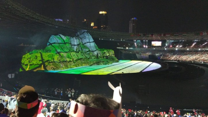 Yang luar biasa itu tata panggung dan tata lampu. Panggungnya yang miniatur perbukitan itu bisa ngeluarin air terjun, trus dengan efek laser bisa mengubahnya jadi di tengah rerumputan, tepi pantai atau laut sekalian. Panggungnya sendiri punya gunung besar yang awalnya hijau bisa kaya puncak gunung berapi. Trus penari dan atlet yang estafet mengantarkan obor bisa naik turun di panggung yang kayanya aman. Ngga ada kejadian salah langkah hingga ngglundung misalnya π Karena naik turun di tangga biasa aja resiko itu ada, apalagi naik turun tangga settingan dan lampunya suka gelap. Oya yang masif lainnya ada kapal gedeee tiba-tiba muncul dari pintu kanan. Melintasi panggung trus setelah aksi dan nyanyinya, menuju ke pintu kiri, dekat kita sih. Tadinya mau ngawasin gimana cara lewatin pintunya dengan tiang setinggi itu. Eh ternyata lupa karena pertunjukan di panggung lebih seru daripada mengamati hal-hal teknis π