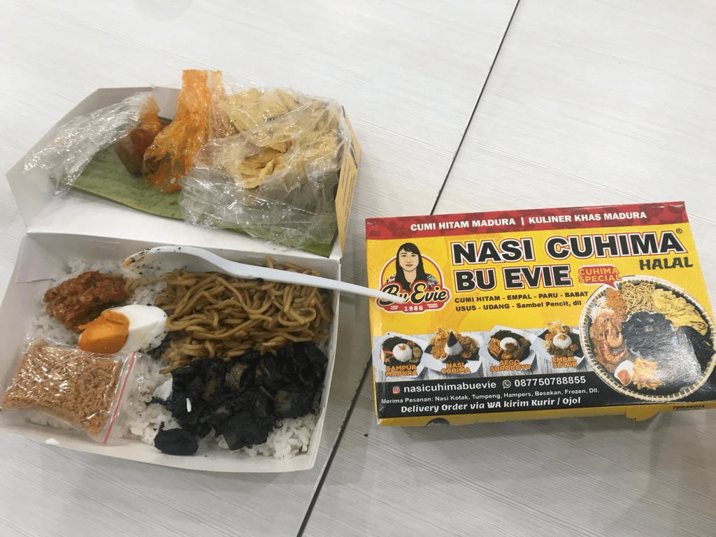 Cumi hitam itu enak banget dah. Cuminya gurih, lebih gurih lagi pakai tinta hitamnya. Orang Madura pinter-pinter masaknya, cumi atau bebek selalu berhasil di tangan mereka. Cuma suka ngga puas makannya, karena cumi hitam itu salah satu pelengkap di nasi madura. Masalahnya lauk lainnya saya ngga doyan-doyan banget, maunya cumi hitamnya yang banyak. Nasi cuhima Bu Evie ini saya tahunya karena dapat nasi kotakan dengan merk ini. Dicobain, la kok cocok, kok enak. Kalau ke tempatnya langsung belum pernah ya, ini ada alamatnya di box.