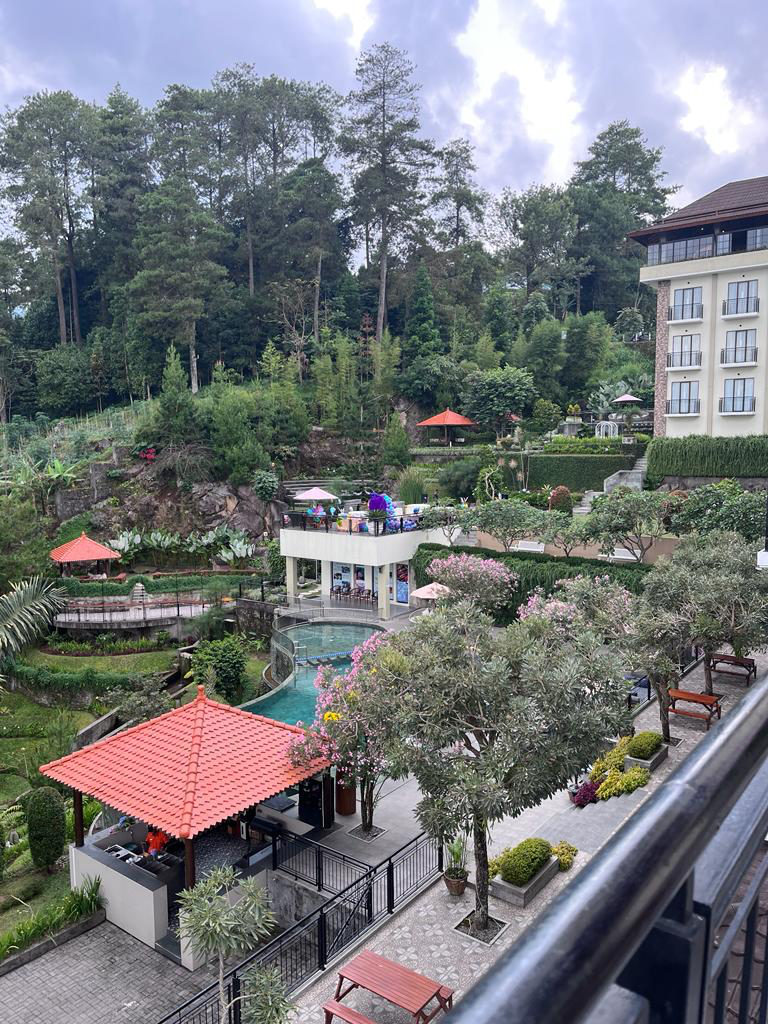 Ini contoh hotel yang worth the money. Paling mahal di kota Tawangmangu, tapi malah jadi hemat. Begitu nyampe hotel yang kamarnya luas dan bersih gini, udah diem aja nikmatin kabut yang cepat banget datangnya dan pekat. Selekas itu sampe kalau kita lihat ke balkon udah ngga keliatan apa-apa. AC ngga usah dinyalain udah dingin. Begitu kabut hilang, langsung keliatan pemandangan indah ini. Hotelnya di tebing, jadi lobbynya sejajar jalan, kita kalau ke kamar malah turun pakai lift. Di tiap level tebingnya dimanfaatkan dengan baik untuk tamu. Ada kolam renang, kolam ikan, gazebo, taman-taman, kandang kelinci, lapangan buat olahraga bareng, api unggun. Di kejauhan keliatan gunung dan perbukitan, kalau gunung Lawu ngga keliatan karena letak hotel di kaki gunung Lawu. Jadi diem aja di hotel udah bisa wisata. Trus makanannya dong, banyak dan enak-enak. Breakfast udah include, dinner ada yang include ada yang ngga. Bayarpun karena jadi tamu hotel jadi didiskon 30%, pilihannya juga daging-dagingan dan masaknya bener. Daaan…ada high tea juga buat tamu hotel. Jam 3-5 bisa nongkrong di cafenya yang cantik dan mencoba berbagai varian teh dan kudapan yang enak-enak. Pas datang, welcome drinknya ditambah kletikan, dan di momen-momen khusus ada free ice cream juga.