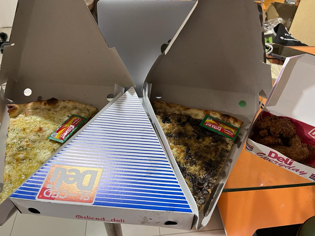Ceritanya ngga sengaja nyari pizza yang potongan gitu, soalnya males makan banyak dengan satu rasa. Kalau sliced kan bisa nyobain semua. Karena pilihan non dagingnya banyak dan menarik, pesanlah beberapa. Per potong 20-an, bahkan ada yg 19 ribu. Begitu datang lewat Gofood, lah kok gede-gede. Tipis, topping full, wangi pula. Enak-enak semua sih. Kalu mau dispill tempatnya, saya nyari juga ngga dapet 😀 Satu-satunya petunjuk di packingnya, coba ke IG @sliced_deli ya.