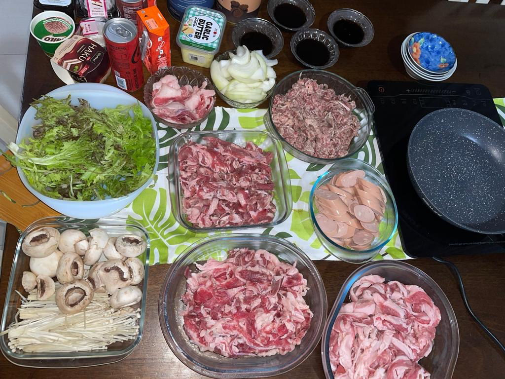 Benernya bikin sendiri bakar-bakaran di rumah karena pada kena Covid, trus gimana ya padahal mau makan-makan bareng. Trus liat jastip lagi rajin jualin daging-daging model rice bowl gitu, boleh lah kita coba. Dagingnya juga ngga paham apaan aja, yang penting tipis-tipis dan rendah lemak (baru kita ketahui setelah bandingin yang banyak lemak dan dikit lemak, susah ngunyahnya gaes yang banyak lemaknya dan berasa dosanya jadi tambah banyak :D). Paduan lainnya ada jamur, ayam, selada, bawang bombay, dan saus-sausan. Sausnya juga bedanya apa, lupa 😛 Ada sukiyaki, teriyaki, bbq, semuanya hitam sih. Butter opsional sih, ngga pake juga ngga apa karena uda ada lemak dari daging. Kompor bisa pake yang listrik atau yang portable supaya bisa ditaruh di meja makan. Kenapa jadi masuk review, karena puas banget makan daging-dagingan tanpa batas gini dan yang pasti lebih murah daripada di resto.