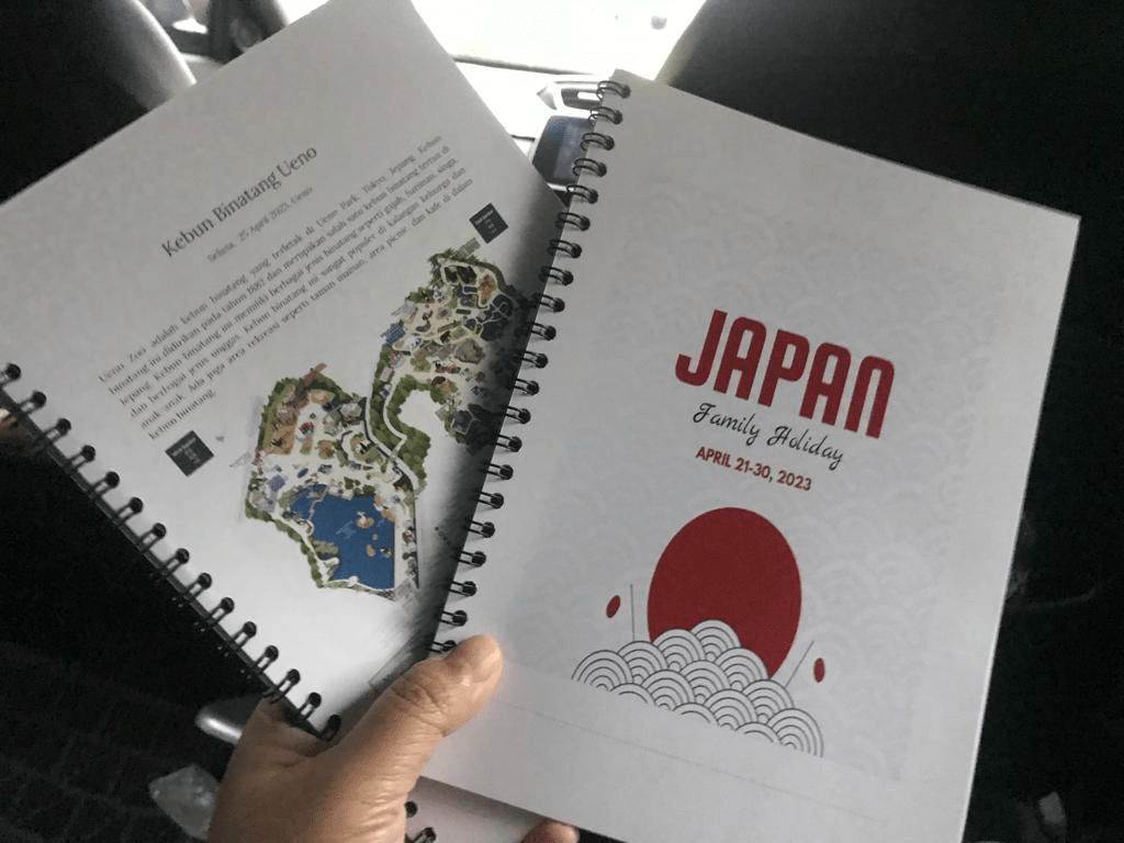 Kalau udah disusun jadwal, saya atur dalam buku kecil model gini. Kok ngga file aja? Oh itu juga 😃 Susunan di Gsheet itu saya simpan di Gdrive, download jadi PDF dan share di grup keluarga, dicetak dan dijilid juga 😃 Selain jadwal kita, juga ada sedikit narasi untuk jelasin itu tempat apa, trus huruf Jepangnya juga disertakan. Jaga-jaga kalau perlu nunjukin tulisannya ke warlok.